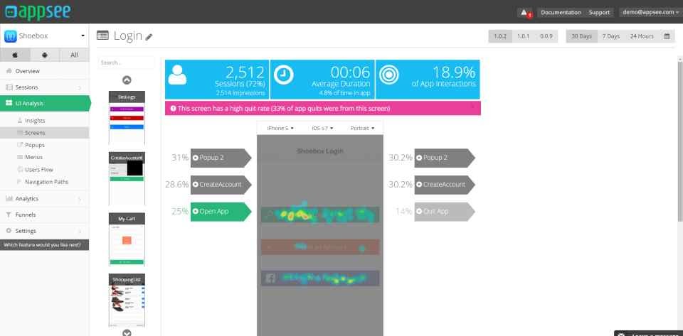 Appsee is a qualitative app analytics SDK. It features innovative functionalities like session recordings and touch heatmaps. The SDK also integrates the app with other built-in analytics tools like conversion funnels, action cohorts, navigation analytics, and even crash video recordings. It allows app developers to replay sequences that led to an app crash. With third-party integrations to platforms such as AppsFlyer, Crashlytics, Optimizely, Salesforce, Slack, and more, Appsee is a business favourite.